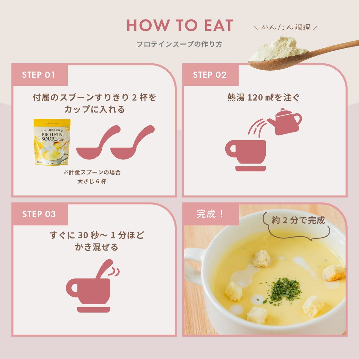 お湯を注ぎ、素早く30秒〜1分ほどかき混ぜていただくとダマになりにくいです。